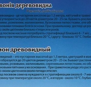 Півонія деревовидна — це чагарник висотою до 1,5 метра, квітучий в травні — червні. На одному кущі утворюється до 20 квітів діаметрам 20 — 25 см. Бувають рослини з білими, ніжно-ліловими, рожевими, малиновими, бузковими пелюстками, але обов’язково з темно-малиновими плямами біля їх основи. При правильному догляді це рослина може радувати вас своїм цвітінням близько п’ятдесяти років.