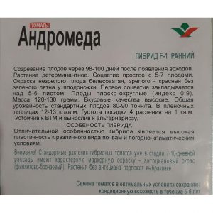 Плоди гладкі червоного колір, але бувають і інші різновиди сорту Андромеда, наприклад золотий або рожевий.Смакові якості дуже хороші, кожен плід важить від 75 до 125 грам. З одного квадратного метра можна зібрати до 12 кг помідорів.