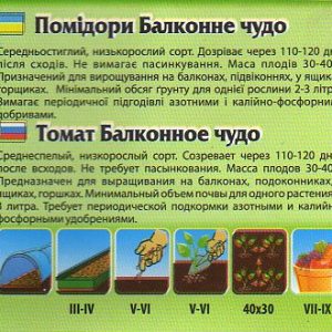 Середньостиглий, низькорослий сорт. Дозрiває через 110-120 днiв пiсля сходiв. Не вимагає пасинкування. Маса плодiв 30-40 г. Призначений для вирощування на балконах, пiдвiконнях, у ящиках, горщиках. Мiнiмальний обсяг ѓрунту для однiєї рослини 2-3 лiтра . Вимагає перiодичного підживлення азотними i калiйно-фосфорними добривами.