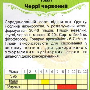 Середньоранній сорт відкритого грунту. Рослина середньоросла,інколи висота досягає 1м, у розгалуженій китиці формується 30 – 40 плодів. Плоди невеликі, круглі, червоні, масою 10 — 20 г. Сорт стійкий до фітофторозу. Товарна врожайність – 6 — 7 кг/кв.м. Плоди використовують для споживання у свіжому вигляді, для декоративного оформлення кулінарних страв та цільноплідного консервування.