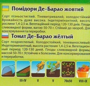 Сорт пізньостиглий. Тіневитривалий, холодостійкий. Врожайність дуже висока. Індетермінантний, висота рослини 1,4-2,5 м. Вегетаційний період 120-130 днів. Плоди сливовидної форми, вагою 50-70 г. Стійкий до хвороб. Для консервування та переробки.