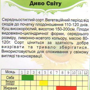 Середньостиглий сорт. Вегетаційний період від сходів до початку плодоношення – 110 — 120 днів. Кущ високорослий, висотою 150 — 200 см. Плоди видовжено-циліндричної форми, середнього розміру, лимонно-жовтого кольору, масою 80 — 120г. Сорт ціниться за здатність добре визрівати та тривало зберігатися. Використовується для споживання у свіжому вигляді та консервації.