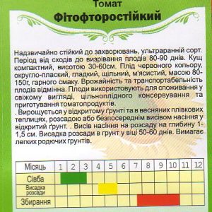 Надзвичайно стійкий до захворювань, ультраранній сорт. Період від сходів до визрівання плодів 80-90 днів. Кущ компактний, висотою 30-60см. Плід червоного кольору, округло-плаский, гладкий, щільний, м’ясистий, масою 80-150г, гарного смаку. Врожайність та транспортабельність плодів відмінна. Плоди використовують для споживання у свіжому вигляді, цільноплідного консервування та приготування томатопродуктів.