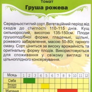 Томат Груша Рожева — від сходів до плодоношення 110-115 днів. Сорт, придатний для вирощування у відкритому та закритому ґрунті. Рослина високоросла — 1,3-1,5 м, індетермінантного типу. Гілка проста, з 5–8 плодами. Плід грушовидний, рожевого кольору, масою 80-150 г, не розтріскується. Сорт високоврожайний, лежкий, гарний для консервування цілими плодами.