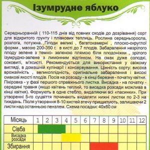 Середньоранній, партенокарпічний. Вегетаційний період – 98 — 105 днів. Рослини висотою до 1 м. Плоди круглі, яскраво-зелені, соковиті, масою 100 — 200 г, транспортабельні. Достигають до масової появи фітофторозу. Сорт з добрими смаковими якостями, придатний для споживання свіжим і для переробки.