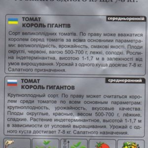 Великоплідний сорт. Вважається королем серед томатів за всіма основними параметрами: крупноплідність, врожайність, смакові якості. Плоди округлі, червоні, вагою до 1000 г, лежкі, солодкі.Підходять як для салатів, так і для зимових заготовок. Рослина індетермінантна, висотою 1-1,7 м в залежності від умов вирощування. Урожай з одного куща досягає 7-8 кг. Сорт вирощується у відкритому грунті і в теплицях, на 1 кв.м розміщують 2-3 рослини.
