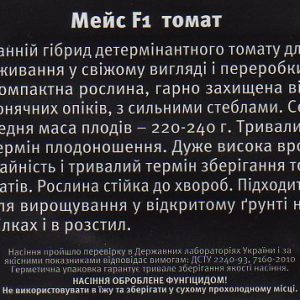 Насіння гібриду Мейс F1 від турецької селекційної компанії Yuksel (Юксел). Сорт раннього детермінантного томата. Низькоросла рослина з сильними стеблами і короткими міжвузлями. Великі листя темно-зеленого кольору, прекрасно захищають томат від сонячних опіків. Тверді, ароматні плоди червоного кольору, вагою понад 220 гр. Дуже легко збираються і відмінно зберігають свій зовнішній вигляд довгий час. Помідори сорту Мейс F1 дають високі врожаї і стійкі до основних хвороб. Даний гібрид призначений для посадки в закритому і відкритому грунтах. Насіння томатів оброблені. Зберігати їх потрібно в прохолодному, сухому місці.