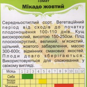 Середньопізній сорт. Вегетаційний період від сходів до початку плодоношення 130-140 днів. Кущ високорослий, висотою 150-250см. Плід плоскоокруглий, великий, м’ясистий, щільний, жовтого забарвлення, масою 300-600г, відмінних смакових якостей. Плоди довго зберігаються. Використовуються для споживання у свіжому вигляді.