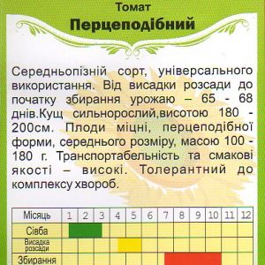 Середньопізній сорт, універсального використання. Від висадки розсади до початку збирання урожаю – 65 — 68 днів.Кущ сильнорослий,висотою 180 -200см. Плоди міцні, перцеподібної форми, середнього розміру, масою 100 — 180 г. Транспортабельність та смакові якості – високі. Толерантний до комплексу хвороб.