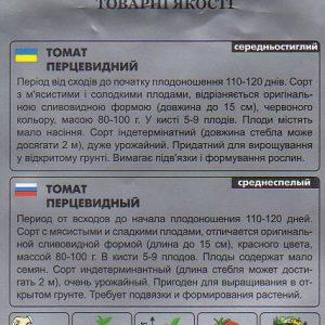 Томат перцевидний відноситься до середньостиглих сортів сливовидноъ форми. Рослина досягає заввишки 1,5 м. В кисті має 4-5 плодів, які містять м’яло насіння. Закладається перше суцвіття над 10-12 листом. В середньому в кисті перцевидного помідора виростає 6-9 плодів. Урожайність становить до 9 кг / кв. м. Що стосується термінів дозрівання, то від сходів і плодоношення проходить 112- 115 днів.