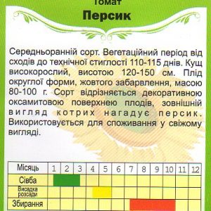 Середньранній сорт. Вегетаційний період від сходів до технічної стиглості – 110 — 115 днів. Кущ висотою 50 – 100 см. Плід округлої форми, жовтого забарвлення, масою 80 — 100 г. Сорт відрізняється декоративною оксамитовою поверхнею плодів, зовнішній вигляд яких нагадує персик. Використовується для споживання у свіжому вигляді.