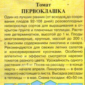 Один з кращих ранніх (від сходів до дозрівання плодів 92-108 днів) рожевоплідний низькорослих сортів для вирощування в плівкових теплицях і відкритому грунті. Рослина детермінатное, висотою до 1 м. Плоди багатокамерні, великі, масою до 200 г, з високим вмістом лікопіну і цукру. Рекомендуються для свіжих літніх салатів і консервування шматочками. Особливо апетитно і ефектно виглядають нарізки томатів різного кольору. Урожайність однієї рослини до 6 кг. Посів на розсаду — в кінці березня — початку квітня. Пікіровка — в фазі першого справжнього листка. Висадка розсади в теплиці — в травні. Схема посадки: 40х50 см.