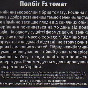 Великоплідний детермінантний гібрид томату для відкритого грунту. Дозрівання починається на 70 день від появи сходів. На одному суцвітті формується до 6-8 великих округлих плодів масою 200-250 г. Томати відмінно транспортуються не втрачаючи товарних і смакових якостей.