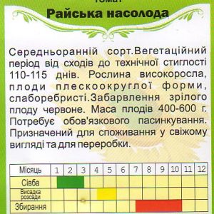 Середньоранній сорт.Вегетаційний період від сходів до технічної стиглості 110-115 днів. Рослина високоросла, плоди плескоокруглої форми, слаборебристі.Забарвлення зрілого плоду червоне. Маса плодів 400-600 г. Потребує обов’язкового пасинкування. Призначений для споживання у свіжому вигляді та для переробки.