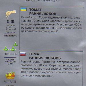 Ранній детермінантний сорт. Кущ висотою 50-70 см. Плід рожевого кольору, плоско-округлої форми, вагою до 400 г.Культура тепло — світлолюбна. Вирощувати розсадою або висівом насіння в грунт. Насіння перед висівом краще обробляти 1% розчином марганцевокислого калію. Висів насіння на глибину 1-1,5 см. Висаджувати розсаду у віці 50-60 днів. Потребує легких родючих грунтів. Добре реагує на удобрювання грунту.