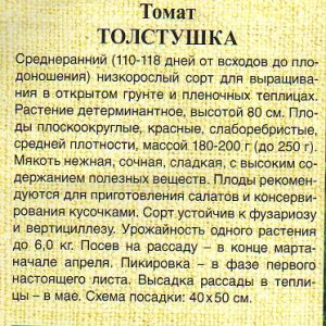 Середньоранній (110-118 днів від сходів до плодоношення) низькорослий сорт для вирощування в плівкових теплицях і відкритому грунті. Рослина детермінантна, висотою 80 см. Плоди плоско, червоні, слаборебристі, середньої щільності, масою до 180-200 (до 250 г). М’якоть ніжна, соковита, солодка, з високим вмістом корисних речовин. Плоди рекомендуються для приготування салатів і консервування шматочками. Сорт стійкий до фузаріозу та вертіціллезу. Урожайність однієї рослини до 6,0 кг. Посів на розсаду — в кінці березня — початку квітня. Пікіровка — в фазі першого справжнього листка. Висадка розсади в тепліци- в травні. Схема посадки: 40х50 см.
