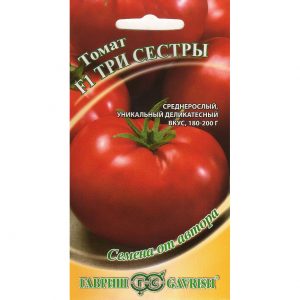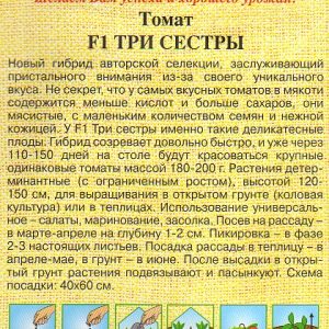 Новий гібрид авторської селекції, що заслуговує пильної уваги через свій унікальнимй смак. Не секрет, що у найсмачніших томатів в м’якоті міститься менше кислот і більше цукрів, вони м’ясисті, з невеликою кількістю насіння і ніжною шкіркою. У F1 Три сестри саме такі делікатесні плоди. Гібрид дозріває досить швидко, і вже через 110-150 днів на столі будуть красуватися великі однакові томати масою 180-200 г. Рослини детермінантні (з обмеженим зростанням), висотою 120-150 см, для вирощування у відкритому грунті (коловими культура) або в теплицях.Використання універсальне — салати, мариновані, засолювання. Посів на розсаду в березні-квітні на глибину 1-2 см. Пікіровка в фазі 2-3 справжніх листків. Посадка розсади в теплицю в квітні-травні, в грунт — в червні. Після висадки у відкритий грунт рослини підв’язують і пасинкують. Схема посадки: 40 × 60 см.
