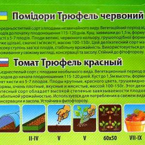 Середньостиглий сорт з плодами незвичайного виду. Вегетаційний період від сходів до початку плодоношення 115-120 днів. Кущ до 1,5 м висоти, формує кисті з 5-7 плодів. Плоди великі, червоного кольору, грушоподібної форми, дуже щільні, смачні і м’ясисті, масою 100-150г. Цей делікатесний сорт має високу ступінь зав’язі плодів, стабільну врожайність. Використовується для споживання у свіжому вигляді, консервації та засолу. Стійкий до фітофторозу.