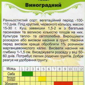 Ранньостиглий сорт, вегетаційний період 100-110 днів. Кущ заввишки 1,5-2 м, красивий з багатьма пасинками та великою кількістю плодів на них. Плід круглий, червоного кольору, масою 15-30 г.