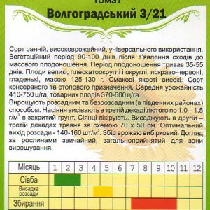 Сорт ранній, високоврожайний, універсального використання. Вегетаційний період 90-100 днів після з’явлення сходів до масового плодоношення триває 35-55 днів. Плоди великі, плескато-округлі і округлі, яскраво-червоні, гладенькі, масою 125-130г. Смакові якості високі. Сорт консервного та столового призначення. Середня урожайність 410-750ц/га, товарних плодів 370-600ц/га.