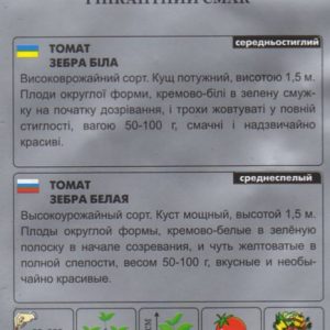 Індетермінантний середньостиглий сорт томата для теплиць і відкритого грунту. Кущ високорослий, вимагає підв’язки. Урожайний — як правило зав’язує всі плодоносні кисті. Формує круглі плоди незвичайного забарвлення: нестиглі — зелені в білу смужку, а при дозріванні стають кремово-білими з ледве помітними золотавими смужками. Вага зрілих томатів досягає 50-100 г. Смак чудовий з солодкувато-фруктовими відтінками. Консистенція плодів щільна, шкірка ніжна, прозора. Сорт невибагливий, але відмінно відгукується на підживлення добривами. Призначення — універсальне.
