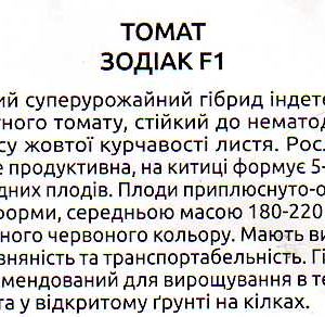 Томат Зодиак среднеранний индетерминантный гибрид, мясистых, красных, плоско-круглых плодов, весом 180-220 г. Гибрид Зодиак характеризуется тем, что он невосприимчив к болезням свойственным томатным культурам, особенно к нематоде и вирусу кучерявости листьев. Посадка осуществляется в теплицах и на открытом грунте с подвязкой к кольям.