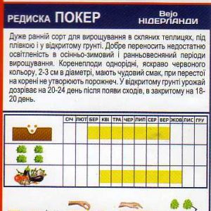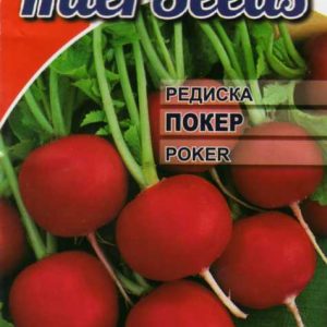 Покер – дуже ранній сорт редису для вирощування в скляних теплицях, під плівкою і у відкритому ґрунті. Добре переносить недостатню освітленість в осінньо-зимовий і ранньовесняний періоди вирощування. Невелике бадилля, стандартні однорідні яскраво-червоні коренеплоди, в діаметрі 2-3 см, мають чудовий смак, при перестої на корені не утворюють порожнеч, дуже довго зберігають товарний вигляд. У відкритому ґрунті урожай дозріває на 20-24 день після появи сходів, в закритому ― на 18-20 день