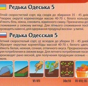 Лiтнiй скоростиглий сорт, вiд сходiв до збирання 35-45 днiв. Утворює округлi коренеплоди масою 40-70 г, бiлого кольору. М’якоть
