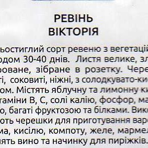 Ранньостиглий сорт ревеню з вегетаційним періодом 30-40 днів. Листя велике, злегка гофроване, зібране в розетку. Черешки товсті, соковиті, ніжні, з солодкувато-кислим смаком. Містять яблучну та лимонну кислоту вітаміни В, С, солі калію, фосфор, магній, залізо, багаті фруктозою та білками. Використовують черешки для приготування варенья, джема, кисілю, компоту, желе, мармеладу, роблять вино та начинку для пиріжків.