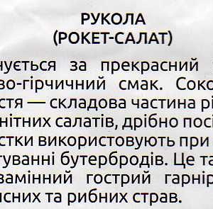 Рукола (рокет-салат) — салатна рослина з родини Капустяних, має терпкий горіхово-гірчичний насичений смак. Сходи зовні дуже схожі з редискою, з’являються вже на 5-6 день після посіву. Період вегетації — 20-24 дня, висота розетки 20-22 см. Оптимальний температурний режим для інтенсивного росту + 16-18 ° C. Для посіву салатних рослин бажано підбирати місця з хорошим освітленням. Рукола (рокет-салат) є джерелом речовин, необхідних для організму, вона містить вітаміни (А, групи В, РР, С, і Е), макроелементи (калій, кальцій, магній, натрій, фосфор), і мікроелементи (залізо, марганець , мідь, селен, цинк, йод). В їжу використовуються молоденькі листочки (в свіжі салати, піцу, випічку, пасту, або використовують в якості овочевої добавки в м’ясних стравах), квітки (додаються в страви як пряність), і насіння (використовують для виробництва гірчиці і масла).