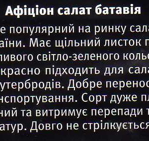 Дуже популярний на ринку салатів України. Має щільний листок привабливого світло-зеленого кольору. Прекрасно підходить для салатів та бутербродів. Добре переносить транспортування. Сорт дуже пластичний та витримує перепади температур. Довго не стрілкується.