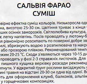 Сальвія блискуча Фарао (Salvia splendens Farao). Неймовірно ефектна суміш кольорів. Низькоросла однорічна рослина, висотою 25-30 см. Цвітіння триває з кінця червня до перших осінніх заморозків. Світлолюбива культура, але витримує легку напівтінь. Посів проводять у лютому — березні. Насіння рівномірно розсипають по поверхні добре зволоженої землі, збризкують водою з розпилювача та накривають склом або прозорою плівкою. Рекомендований температурний режим 20-25 °С. Сходи з’являються через 10-15 днів. Пікіровку проводять у фазі 2-3 справжніх листочків. Для формування пишного кущика верхівку розсади рекомендується прищипнути. У відкритий ґрунт рослини висаджують у другій половині травня на відстані 20-30 см одна від одної. Використовують для оформлення клумб, балконів, альпінаріїв, а також у горщикових композиціях.