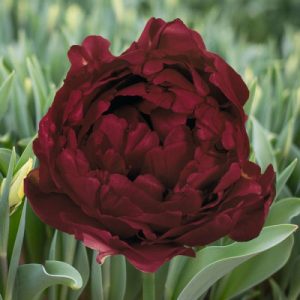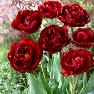 Махрові тюльпани Антарцит глибокого бордового забарвлення відрізняються півонієподібною формою, створеної з безлічі хвилястих пелюсток. Вони прикрашають клумби протягом практично всього травня, розпускаючись протягом першого тижня і відцвітаючи лише до фіналу.