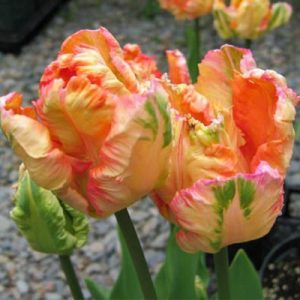 Папуговий тюльпан Apricot Parrot – це вибух кольору, представлений на одній квітці, тому що бутони мають різне забарвлення: зеленувато-біле, кремово-рожеве, яскраво-оранжеве і ніжно-персикове. Унікальність цього сорту не обмежується буйством фарб, краї пелюсток мають рвану структуру, що нагадує крила птаха. Висаджують їх на клумбах, у контейнерах і використовують для зрізки в букети.