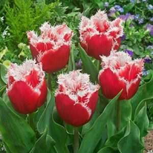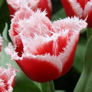 Махровий тюльпан Новий Санта нагадує костюм головного різдвяного чарівника. Червоні пелюстки його покриті пишною білою бахромою, як шуба у Санта Клауса, за що він і отримав свою назву.