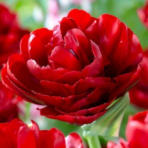 Квітки складаються з великої кількості округлих, акуратно розташованих пелюсток, що нагадують пишні суцвіття півоній. Пелюстки забарвлені в насичений темно-червоний відтінок. Інші особливості: