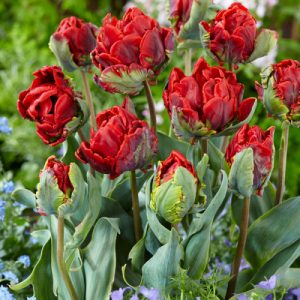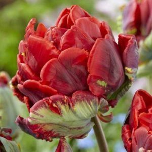 Тюльпан папуговий Rococo Double — шик і грація. Темно-червоні з бордовим відливом пелюстки нагадують крила екзотичної птиці, яка немов застигла у польоті. Кожна «пташка» квітне близько 10 днів, а тривалість цвітіння на клумбі — до 2-3 тижнів. Цей тюльпан — гібрид, який був виведений із простих пізніх сортів.