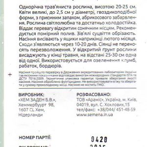 Однорічна трав’яниста рослина 20-25 см заввишки. Квіти великі, до 2,5 см у діаметрі, гвоздикоподібної форми з приємним запахом. Рослина світлолюбна та достатньо холодостійка. Віддає перевагу відкритим сонячним місцям. Рекомендується помірний полив. Зів’ялі суцвіття обрізають. Широко використовується для озеленення клумб, рабаток, бордюрів. Насіння висівають у ящики наприкінці лютого місяця. Сходи з’являються через 10-20 днів. Сіянці не переносять пере-зволоження. У відкритий ґрунт рослини висаджують у кінці травня, на відстані 25-30 см одна від одної.