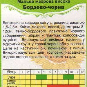 Багаторiчна красиво квiтуча рослина висотою 1,5-2,5м. Квiтки махровi, великi, дiаметром 8- 12см, темно-бордового практично чрного забарвлення, зiбранi у гiгантськi колосовиднi суцвiття. Вирощуеться висiво·м нас.ння у вiдкритий фунт у травнi-червнi або у вереснi. Цвiте на наступний. рiк, починаючи з липня. Використовуеться для групових насаджень вздовж огорож та парканів, а також на зрiз.