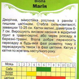 Двухлетняя, зимостойкое растение с ранним и пышным цветением. Стебли сильноветвистые, высотой 15 — 25 см. Цветки крупные, диаметром 6 — 7 см. Выращивают посевом семян в открытый грунт в мае — августе, или через рассаду в марте — мае. Виола хорошо переносит пересадку в любой фазе развития, поэтому ее пересаживают также и в фазе цветения. Цветет с апреля по октябрь следующего года.. Посетив наш магазин семян почтой «Roslyna.com.ua», Вы сможете приобрести оптом и в розницу семена овощей: арбуза, гороха, капусты брокколи, кукурузы, огурцов, пряных и целебных трав, свеклы, тыквы, артишока, дыни, капусты брюссельской, лагенарии, огурцов драже, редиса, сельдерея, укропа, баклажана, земляники, купусты кольраби, лука, патиссона, редьки, скорцонера, фасоли, бамии, кабачка, капусты пекинской, люффа, перца, репы, томатов, чечевицы, бруквы, капусты, капусты цветной, моркови, петрушки, салата; семена цветов и семена цветов элитных сортов.