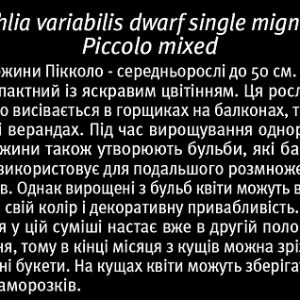 Жоржини Пікколо — середньорослі до 50 см. Кущ компактний із яскравим цвітінням. Ця рослина часто висівається в горщиках на балконах, терасах і верандах. Під час вирощування однорічні жоржини також утворюють бульби, які багато хто використовує для подальшого розмноження квітів. Однак вирощені з бульб квіти можуть втрачати свій колір і декоративну привабливість. Цвітіння у цій суміші настає вже в другій половині липня, тому в кінці місяця з кущів можна зрізати пишні букети. На кущах квіти можуть зберігатися до заморозків.